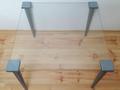 Sprzedam używany szklany stolik z nogami w kolorze stalowym.