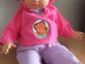 fioletowe ubranko, słodką różową bluzę z kapturem i różowe plastikowe buciki. Doskonała zabawka dla